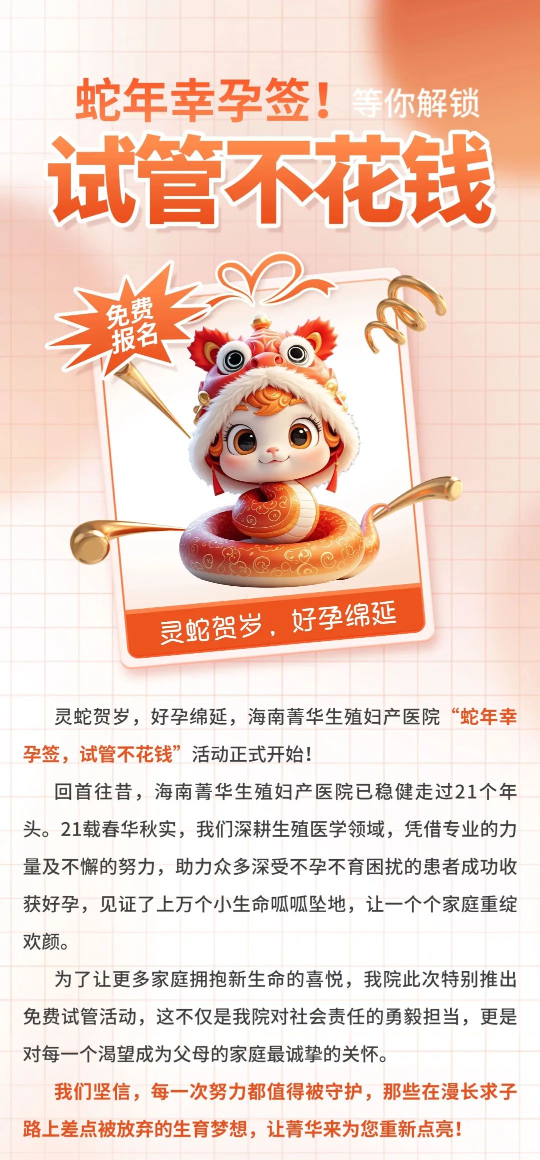 "备孕几年没结果?“ 可能你只差这一次关键检查!海南菁华现推出 ”女性不孕症筛查公益活动“ 200个不孕症免费筛查名额 为好孕护航! 你的生育力到底被什么卡住了? 让我们免费帮您找答案! 活动时间 即日起-2025年5月31日 活动对象 1、年...