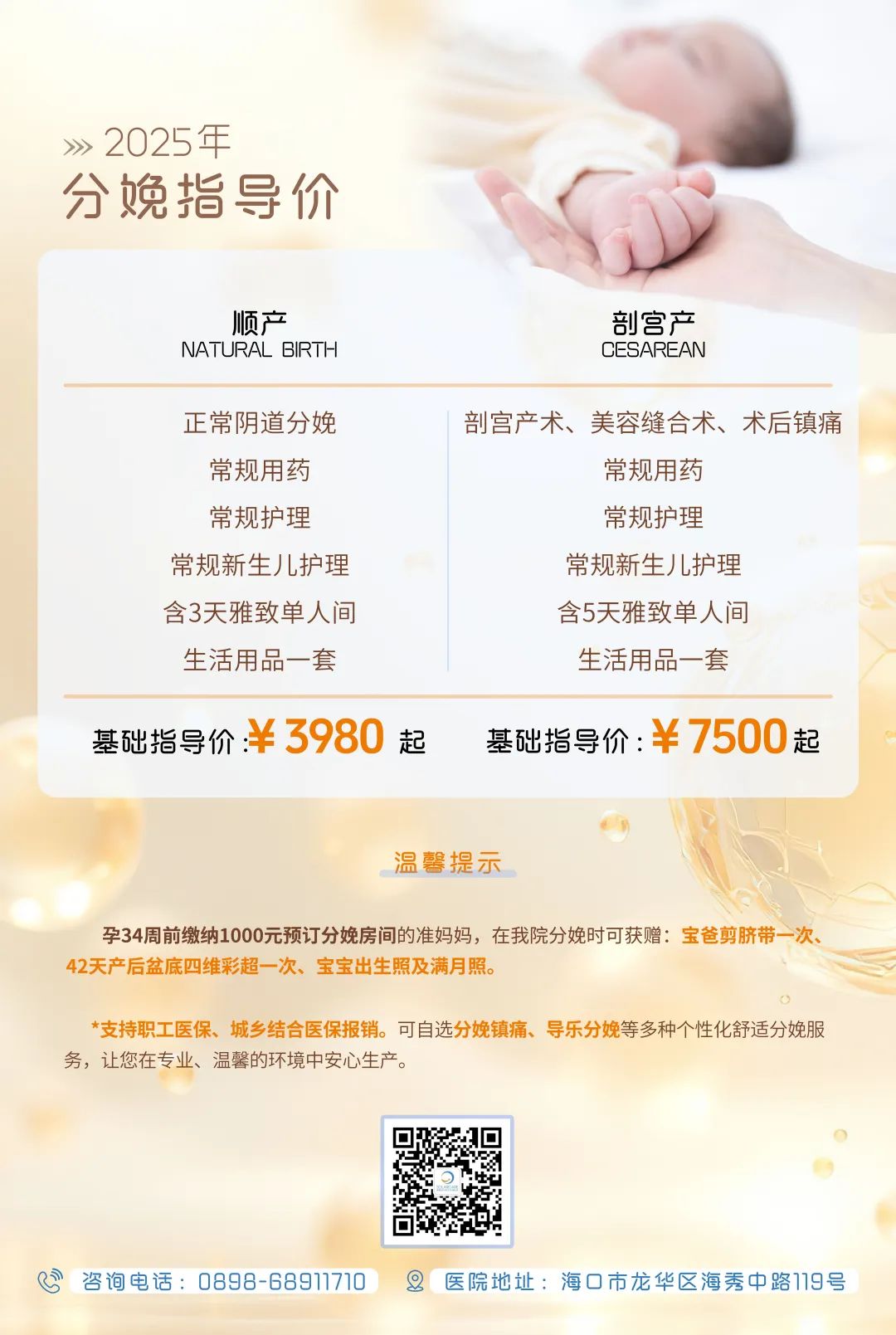 海南菁华2025年全新分娩指导价来袭:顺产基础指导价3980起,剖宫产基础指导价7500起,并支持职工医保、城乡结合医保报销。还可自选分娩镇痛、导乐分娩等多种个性化舒适分娩服务,让您在专业、温馨的环境中安心生产。