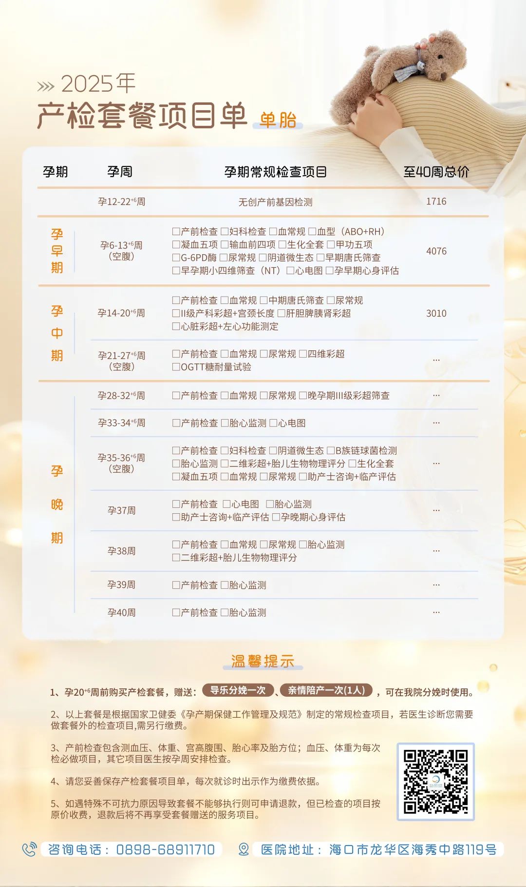 想要一个安心、舒适的产检体验吗?我们的产检无忧套餐正是您的不二之选!现在预订套餐,孕6-40周单胎产检套餐低至4076元,额外可获赠导乐分娩及亲情陪产一次哦!同时还可添加产科专家微信,与专家进行一对一交流,确保孕妈妈遇到问题能够得到及时解决,为您的孕产全程保驾护航。