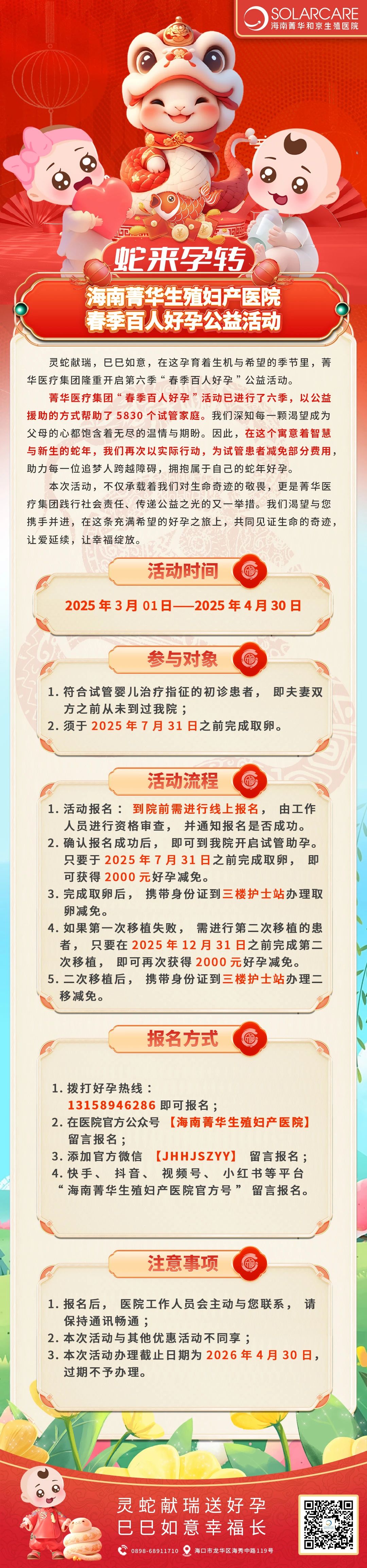 "备孕几年没结果?“ 可能你只差这一次关键检查!海南菁华现推出 ”女性不孕症筛查公益活动“ 200个不孕症免费筛查名额 为好孕护航! 你的生育力到底被什么卡住了? 让我们免费帮您找答案! 活动时间 即日起-2025年5月31日 活动对象 1、年...